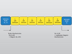 Spätester Beginn: am Ende von sechs 24-h-Zeiträumen nach dem Ende der vorangegangenen wöchtenlichen Ruhezeit.